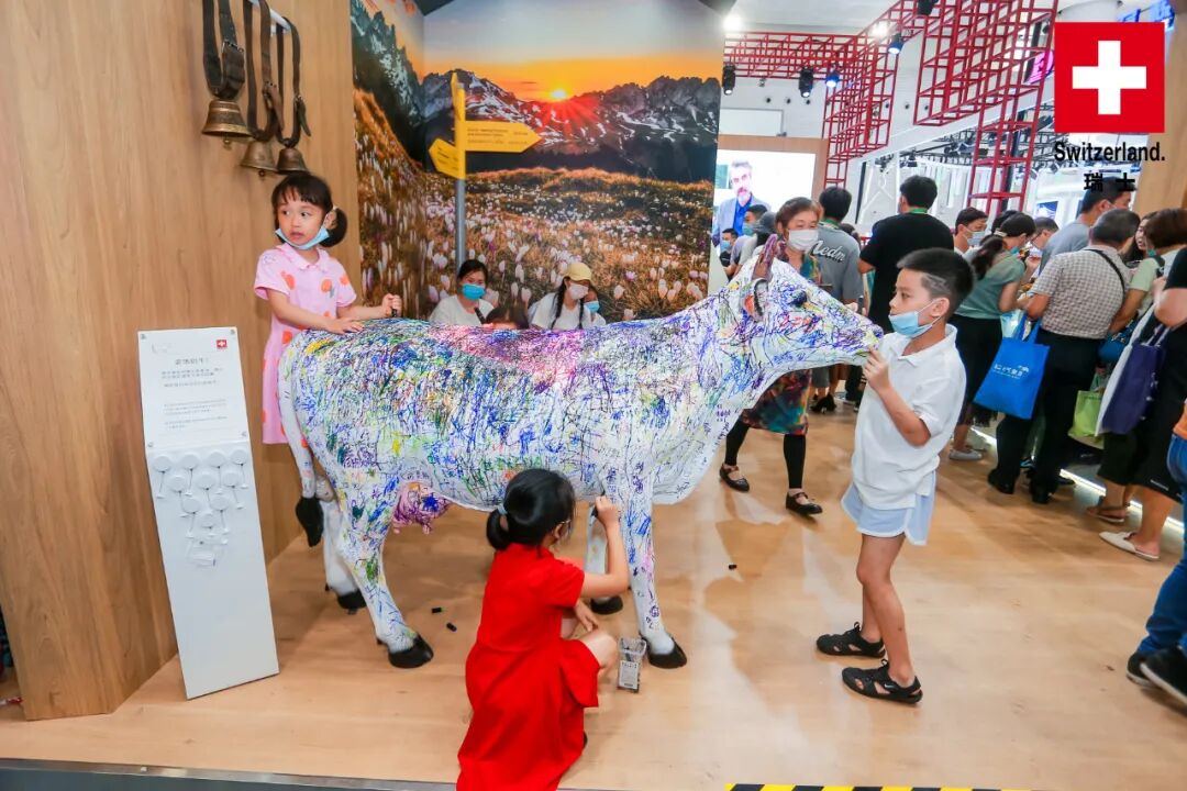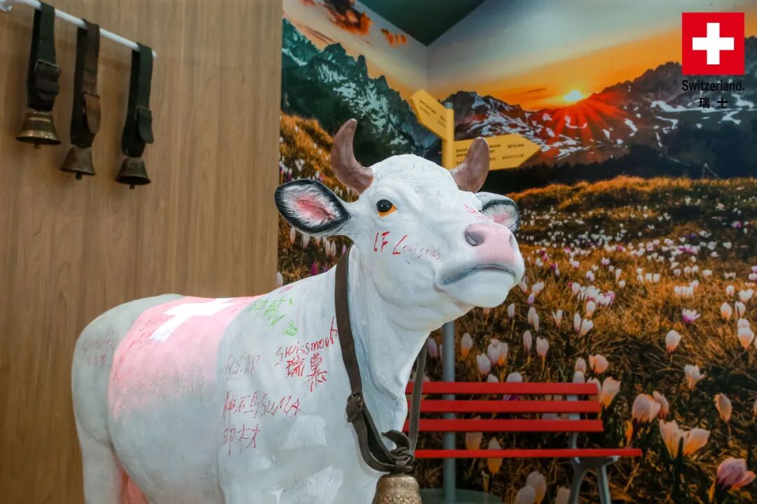 在展馆入口处,洁白的装饰奶牛引得观众纷纷驻足写下美好寄语,拉一拉墙上摇曳的牛铃,品一品独特的瑞士美食,在秀丽的阿尔卑斯风光前坐在长椅上小憩,不远处传来瑞士展商精彩的产品讲解。